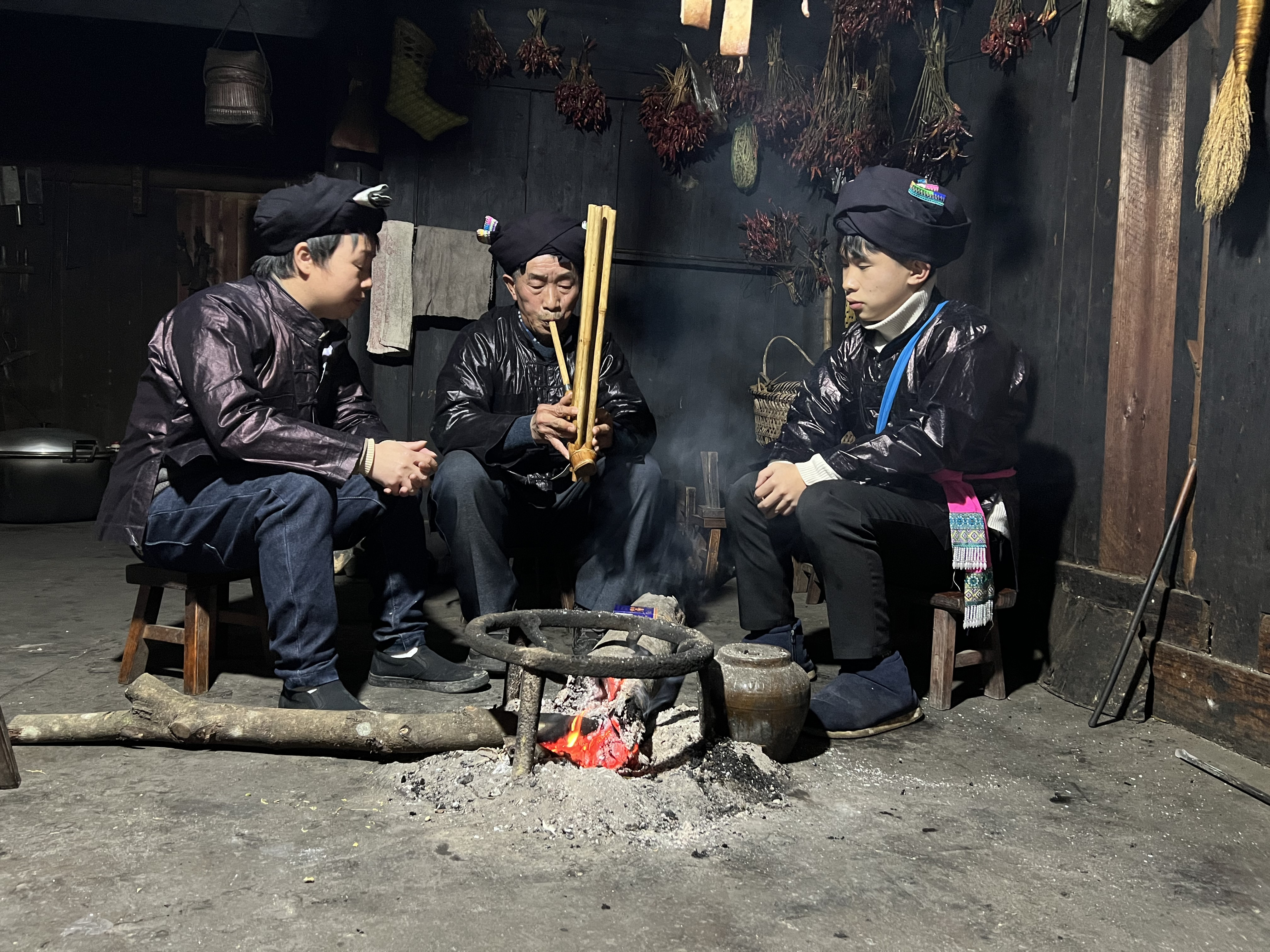 梁强(击鼓者)与青年群众共同学习、交流芦笙演奏技巧